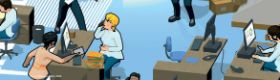 L’outil TutoPrév’ Interactif Métiers de la propreté comprend trois scènes illustrées représentant des situations de travail. Sur chaque visuel, les nouveaux embauchés doivent repérer les situations à risque et choisir les mesures de prévention les plus pertinentes.
