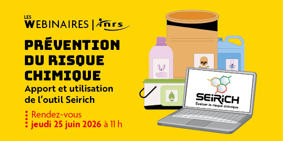L’INRS organise un webinaire sur la démarche de prévention du risque chimique et l’apport de l’outil Seirich dans cette démarche. Les produits chimiques, qu’ils soient manipulés ou émis, sont présents dans tous les secteurs d’activité. De nombreux salariés sont ainsi exposés à ces produits qui peuvent induire des effets néfastes sur la santé. Il est donc primordial en entreprise d’évaluer et de prévenir les risques chimiques afin de protéger la santé des salariés.