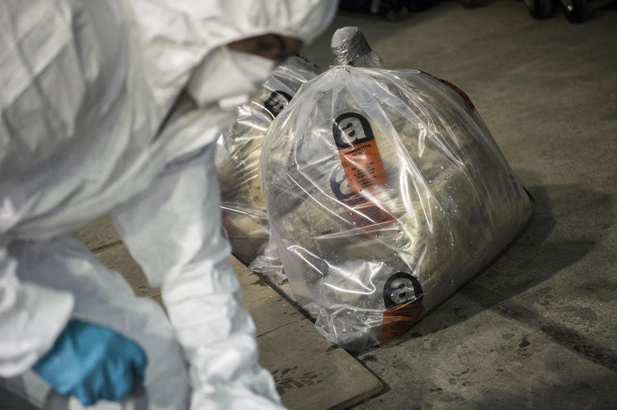 Opérateur équipé de protection adaptée à la manipulation de sacs de déchets amiantés