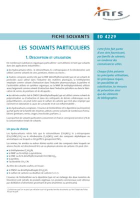 Cette fiche fait partie d'une série fournissant, par famille de solvants, un condensé des connaissances utiles. Chaque fiche présente les principales utilisations, les principaux risques, les possibilités de substitution, les mesures de prévention ainsi que des éléments de bibliographie. Les solvants particuliers rassemblent des substances que l'on ne peut classer dans les grandes familles de solvants organiques. On y trouve des dérivés nitrés (nitrométhane, 2-nitropropane, nitrobenzène), des dérivés azotés (triéthylamine, N,N-diméthylformamide ou DMF, ...), des dérivés soufrés (diméthylsulfoxyde ou DMSO, sulfure de carbone).