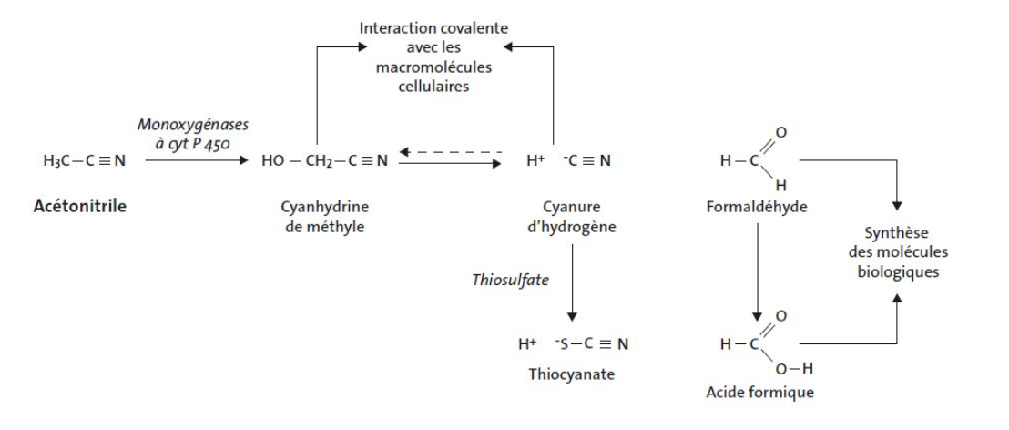L’acétonitrile est métabolisé, dans tous les tissus avec une prédominance dans le foie, par le système de monooxygénases à cytochrome P450 en cyanhydrine de méthyle instable qui se décompose en formaldéhyde et cyanure d’hydrogène ; celui-ci est, par la suite, conjugué avec du thiosulfate pour former du thiocyanate (voir fig. 1). La transformation en cyanure d’hydrogène est dépendante du taux d’oxygène et de NADPH ; elle est inactivée par la chaleur et inhibée par le NADH. Elle est plus lente que celle des autres nitriles et de vitesse variable selon les espèces (la souris étant la plus rapide).