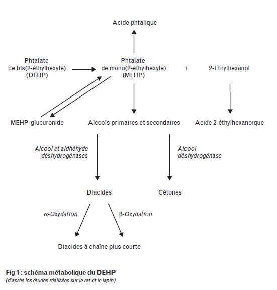 Comme chez l’animal, le métabolisme du DEHP aboutit à la formation de nombreux métabolites (Fig 1). Le DEHP est d'abord hydrolysé (par des estérases ou lipases lors d'une ingestion) avec formation du phtalate de mono(2-éthylhexyle) (MEHP), métabolite majoritaire dans le sang, et du 2-éthylhexanol, lui-même étant rapidement hydrolysé en acide 2-éthylhexanoïque (2-EHA). Puis le MEHP est oxydé en différents métabolites et dans une moindre mesure hydrolysé en acide ortho-phtalique. Le métabolisme oxydatif débute par une hydroxylation de la chaîne éthylhexyl en différentes positions ; il se forme alors des alcools primaires ou secondaires qui sont ensuite oxydés en acides carboxyliques.