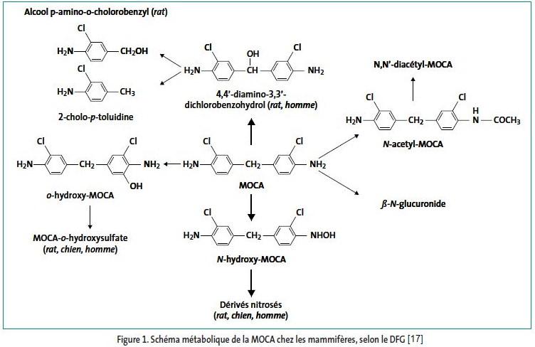 Quatre-vingt-dix pour cent de la quantité absorbée est métabolisée par le cytochrome P450 en intermédiaires réactifs ; le N-hydroxy-MOCA est le principal métabolite toxique susceptible de se lier avec l'ADN et/ou les protéines pour former des adduits.