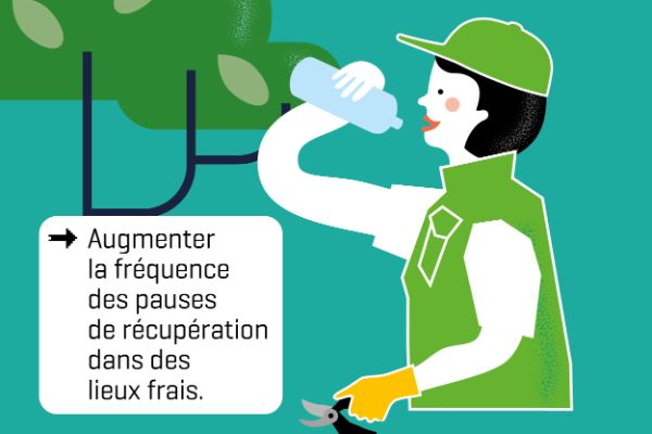 La prévention la plus efficace consiste à éviter ou, à défaut, à limiter l’exposition à la chaleur. Pour cela, il faut agir sur l’organisation du travail (augmentation de la fréquence des pauses, limitation du travail physique, rotation des tâches…), l’aménagement des locaux (zones de repos climatisées, ventilation), les matériels et les équipements en associant les représentants du personnel (membres du CSE ou CSSCT) et le service de prévention et de santé au travail.