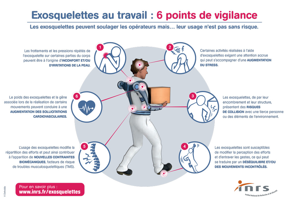Certains troubles musculosquelettiques (TMS) peuvent êtres induits ou aggravés par une mauvaise synergie musculaire, un défaut de proprioception (perception du mouvement et de la position du corps dans l’espace) ou des mouvements inadaptés. En modifiant le fonctionnement intrinsèque de l’articulation (force ajoutée, modification des contraintes lors du mouvement, réduction des retours sensoriels), l’usage d’exosquelettes peut avoir des répercussions délétères sur l’appareil locomoteur. Il est bien connu que la seule réduction de l’activité musculaire n’est pas suffisante pour prévenir la survenue de TMS. |