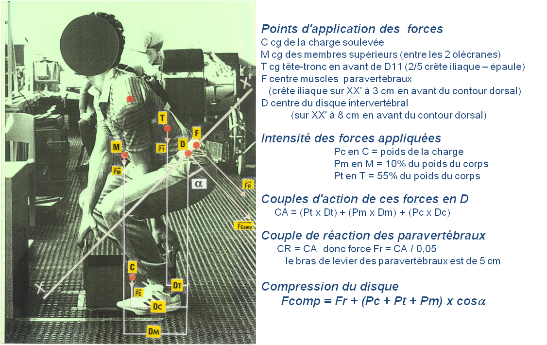 Un modèle biomécanique d'évaluation spécifique de la contrainte liée à la manutention manuelle (Wax et coll. 1987) peut être utilisé. La méthode de calcul est schématisée dans la figure ci-dessous. Une simple photographie de profil, avec une référence d'échelle, permet de calculer la compression du disque qui est le paramètre le plus représentatif de la contrainte lombaire. Si la compression est inférieure à 350 dN le risque est faible et acceptable. Entre 350 et 650dN le risque impose une démarche de prévention et au-dessus de 650 dN le risque est très élevé et la situation impossible à tenir.