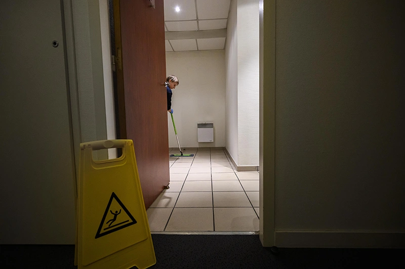 Madame M., technicienne de surface pour une entreprise de ménage pour des bureaux et des commerces.